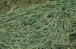 Hay is grass, legumes, or other herbaceous plants that have been cut and dried to be stored for use as animal fodder, either for large grazing animals raised as livestock, such as cattle, horses, goats, and sheep, or for smaller domesticated animals such as rabbits[1] and guinea pigs. Pigs can eat hay, but they do not digest it as efficiently as herbivores do.