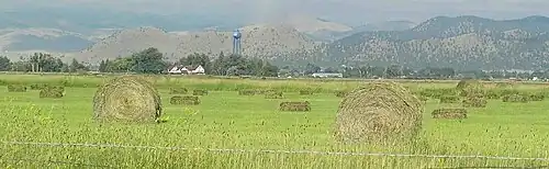 Modern hay production often relies on artificial fertilizer and herbicides. Traditionally, manure has been used on hayfields, but modern chemical fertilizers are used today as well. Hay that is to be certified as weed-free for use in wilderness areas must often be sprayed with chemical herbicides to keep unwanted weeds from the field, and sometimes even non-certified hayfields are sprayed to limit the production of noxious weeds. Organic forms of fertilization and weed control are required for hay grown for consumption by animals whose meat will ultimately be certified organic. To that end, compost and field rotation can enhance soil fertility, and regular mowing of fields in the growth phase of the hay will often reduce the prevalence of undesired weeds. In recent times, some producers have experimented with human sewage sludge to grow hay. This is not a certified organic method and no warning labels are mandated by EPA.[19] One concern with hay grown on human sewage sludge is that the hay can take up heavy metals, which are then consumed by animals.[20] Molybdenum poisoning is a particular concern in ruminants such as cows and goats, and there have been animal deaths.[21][22][23] Another concern is with a herbicide known as aminopyralid, which can pass through the digestive tract in animals, making their resulting manure toxic to many plants and thus unsuitable as fertilizer for food crops.[24] Aminopyralid and related herbicides can persist in the environment for several years.