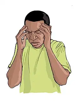 A headache, also known as cephalalgia, is the symptom of pain in the face, head, or neck. It can occur as a migraine, tension-type headache, or cluster headache.[1][2] There is an increased risk of depression in those with severe headaches.[3]