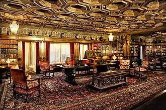 The library is on the second floor, directly above the assembly room.[188] The ceiling is 16th century Spanish, and a remnant is used in the library's lobby.[161] It comprises three separate ceilings, from different rooms in the same Spanish house, which Morgan combined into one.[189] The fireplace is the largest Italian example in the castle. Carved from limestone, it is attributed to the medieval sculptor and architect Benedetto da Maiano.[190] The room contains a collection of over 5,000 books, with another 3,700 in Hearst's study above.[191] The majority of the library collections were sold at sales at Parke-Bernet at 1939 and Gimbels in 1941. The sales saw the disposal of some of the best items, including sets, often signed, of first editions by Charles Dickens, Hearst's favorite author.[191] The library is also the location for much of Hearst's important holding of antique Greek vases.[192]