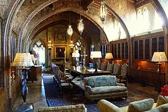 The refectory was the only dining room in the castle, and was built between 1926 and 1927.[173] The choir stalls which line the walls are from the La Seu d'Urgell Cathedral in Catalonia, Spain,[178] and the silk flags mounted on the walls are Palio banners from Siena, Italy.[t][180] Hearst originally intended a "vaulted Moorish ceiling" for the room but, finding nothing suitable, he and Morgan settled on the Italian Renaissance example, dating from around 1600, which Hearst purchased from a dealer in Rome in 1924.[181] Victoria Kastner considered that the flat roof, with life-size carvings of saints, "strikes a discordant note of horizontality among the vertical lines of the room".[182] The style of the whole is Gothic, in contrast to the Renaissance approach adopted in the preceding assembly room.[160] The refectory is said to have been Morgan's favorite interior within the castle.[183] The design of both the refectory and the assembly room was greatly influenced by the monumental architectural elements, especially the fireplaces and the choir stalls used as wainscoting, and works of art, particularly the tapestries, which Hearst determined would be incorporated into the rooms.[184] The central table provided seating for 22 in its usual arrangement of two tables, which could be extended to three or four, on the occasion of larger gatherings.[185] The tables were sourced from an Italian monastery[186] and were the setting for some of the best pieces from Hearst's collection of silverware. One of the finest is a wine cooler dating from the early 18th century and weighing 14.2 kg by the Anglo-French silversmith David Willaume.[187]