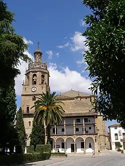 Within a month, Hearst's original ideas for a modest dwelling had greatly expanded. Discussion on the style began with consideration of "Jappo-Swisso" themes.[105] Then the Spanish Colonial Revival style was favored.[106] Morgan had used this style when she worked on Hearst's Los Angeles Herald Examiner headquarters in 1915.[l][15] Hearst appreciated the Spanish Revival but was dissatisfied with the crudeness of the colonial structures in California.[25] Mexican colonial architecture had more sophistication, but he objected to its abundance of ornamentation. Thomas Aidala, in his 1984 study of the castle, notes the Churrigueresque influence on the design of the main block, "flat and unembellished exterior surfaces; decorative urges are particularized and isolated, focused mainly on doorways, windows (and) towers".[109] The 1915 Panama–California Exposition in San Diego held the closest approximations in California to the approach Hearst desired.[110] But his European tours, and specifically the inspiration of the Iberian Peninsula, led him to Renaissance and Baroque examples in southern Spain that more exactly suited his tastes.[m][110] He particularly admired a church in Ronda, Spain and asked Morgan to model the Casa Grande towers after it.[112] In a letter to Morgan dated December 31, 1919, Hearst wrote, "The San Diego Exposition is the best source of Spanish in California. The alternative is to build in the Renaissance style of southern Spain. We picked out the towers of the church at Ronda... a Renaissance decoration, particularly that of the very southern part of Spain, could harmonize well with them. I would very much like to have your views on... what style of architecture we should select."[113] This blend of Southern Spanish Renaissance, Revival and Mediterranean examples became San Simeon's defining style; "something a little different than other people are doing out in California".[113] The architectural writers Arrol Gellner and Douglas Keister describe Casa Grande as "a palatial fusion of Classicism and Mediterranean architecture... [that] transcended the Mission Revival era and instead belonged to the more archaeological Period Revival styles that gained favor after the Panama–California Exposition of 1915".[114]
