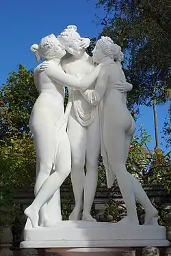 In addition to his classical sculptures, Hearst was content to acquire 19th century versions, or contemporary copies of ancient works; "if we cannot find the right thing in a classic statue we can find a modern one".[96] He was a particular patron of Charles Cassou and also favored the early 19th century Danish sculptor Bertel Thorvaldsen whose Venus Victorious remains at the castle.[96] Both this, and the genuinely classical Athena from the collection of Thomas Hope, were displayed in the Assembly room, along with the Venus Italica by Antonio Canova.[237] Other works by Thorvaldsen include the four large marble medallions in the Assembly room depicting society's virtues.[170] Two 19th century marbles are in the anteroom to the Assembly room, Bacchante, by Frederick William MacMonnies, a copy of his bronze original and Pygmalion and Galatea by Gérôme.[238] A monumental statue of Galatea, attributed to Leopoldo Ansiglioni and dating from around 1882, stands in the center of the pool on the plaza in front of Casa Grande.[239]