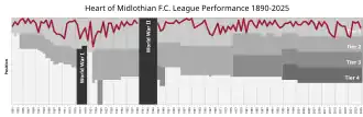 Hearts won the 2020–21 Scottish Championship, finishing ahead of second-placed Dundee by 12 points.[168] This confirmed their return to the Scottish Premiership. In their first season back in the top flight, Hearts finished third and secured European group stage football in the UEFA Conference League. The following season, 2022–23, Hearts secured a fourth-placed finish. After finishing third in the 2023–24 season they returned to European football – initially entering the UEFA Europa League final play-off stage, however they failed to advance and dropped into the UEFA Conference League league stage.[169] After gaining a single point in their first six league games (the worst start to a season in the club's history), manager Steven Naismith was sacked on 22 September 2024, with Neil Critchley replacing him as head coach a month later.[170][171][172]