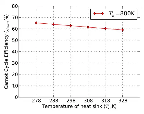 Figure 3: Carnot cycle efficiency with changing heat rejection temperature.