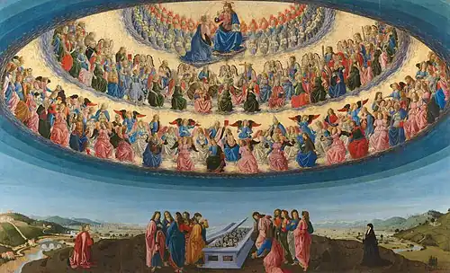 The Assumption of the Virgin, 1475–1476, by Francesco Botticini (National Gallery London), shows three hierarchies and nine orders of angels, each with different characteristics.