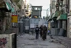 Over the period of the First Intifada and Second Intifada, the Jewish community was subjected to attacks by Palestinian militants, especially during the periods of the intifadas; which saw 3 fatal stabbings and 9 fatal shootings in between the first and second Intifada (0.9% of all fatalities in Israel and the West Bank) and 17 fatal shootings (9 soldiers and 8 settlers) and 2 fatalities from a bombing during the second Intifada,[204] and thousands of rounds fired on it from the hills above the Abu-Sneina and Harat al-Sheikh neighborhoods. On November 15, 2002, 12 Israeli soldiers were killed (Hebron Brigade commander Colonel Dror Weinberg and two other officers, 6 soldiers and 3 members of the security unit of Kiryat Arba) in an ambush.[205] Two Temporary International Presence in Hebron observers were killed by Palestinian gunmen in a shooting attack on the road to Hebron[206][207][208] On March 27, 2001, a Palestinian sniper targeted and killed the Jewish baby Shalhevet Pass. The sniper was caught in 2002. Hebron is one of the three West Bank towns from which the majority of suicide bombers originate. In May 2003, three students of the Hebron Polytechnic University carried out three separate suicide attacks.[209] In August 2003, in what both Islamic groups described as a retaliation, a 29-year-old preacher from Hebron, Raed Abdel-Hamed Mesk, broke a unilateral Palestinian ceasefire by killing 23 and injured over 130 in a bus bombing in Jerusalem.[210][211] In 2007, the Palestinian population in H2 declined due to Israeli security measures such as extended curfews, strict restrictions on movement,[212] the closure of Palestinian businesses and settler harassment.[213][214][215][216] Palestinians are barred from using Al-Shuhada Street, a principal commercial thoroughfare that is locally nicknamed "Apartheid Street" as a result.[202][217]