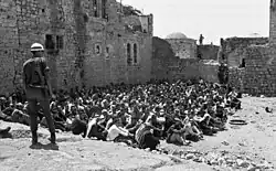 At this time following attempts by the Lithuanian government to draft yeshiva students into the army, the Lithuanian Hebron Yeshiva (Knesses Yisroel) relocated to Hebron, after consultations between Rabbi Nosson Tzvi Finkel, Yechezkel Sarna and Moshe Mordechai Epstein.[144][145] and by 1929 had attracted some 265 students from Europe and the United States.[146] The majority of the Jewish population lived on the outskirts of Hebron along the roads to Be'ersheba and Jerusalem, renting homes owned by Arabs, a number of which were built for the express purpose of housing Jewish tenants, with a few dozen within the city around the synagogues.[147] During the 1929 Hebron massacre, Arab rioters slaughtered some 64 to 67 Jewish men, women and children[148][149] and wounded 60, and Jewish homes and synagogues were ransacked; 435 Jews survived by virtue of the shelter and assistance offered them by their Arab neighbors, who hid them.[150] Some Hebron Arabs, including Ahmad Rashid al-Hirbawi, president of Hebron chamber of commerce, supported the return of Jews after the massacre.[151] Two years later, 35 families moved back into the ruins of the Jewish quarter, but on the eve of the Palestinian Arab revolt (April 23, 1936) the British Government decided to move the Jewish community out of Hebron as a precautionary measure to secure its safety. The sole exception was the 8th generation Hebronite Ya'akov ben Shalom Ezra, who processed dairy products in the city, blended in well with its social landscape and resided there under the protection of friends. In November 1947, in anticipation of the UN partition vote, the Ezra family closed its shop and left the city.[152] Yossi Ezra has since tried to regain his family's property through the Israeli courts.[153]