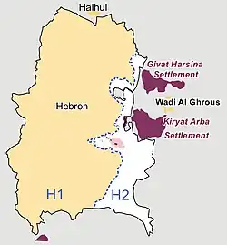 Hebron was the one city excluded from the interim agreement of September 1995 to restore rule over all Palestinian West Bank cities to the Palestinian Authority.[191] IDF soldiers see their job as being to protect Israeli settlers from Palestinian residents, not to police the Israeli settlers. IDF soldiers are instructed to leave violent Israeli settlers for the police to deal with.[192][193] Since The Oslo Agreement, violent episodes have been recurrent in the city. The Cave of the Patriarchs massacre took place on February 25, 1994, when Baruch Goldstein, an Israeli physician and resident of Kiryat Arba, opened fire on Muslims at prayer in the Cave of the Patriarchs, killing 29, and wounding 125 before the survivors overcame and killed him.[194] Standing orders for Israeli soldiers on duty in Hebron disallowed them from firing on fellow Jews, even if they were shooting Arabs.[195] This event was condemned by the Israeli Government, and the extreme right-wing Kach party was banned as a result.[196] The Israeli government also tightened restrictions on the movement of Palestinians in H2, closed their vegetable and meat markets, and banned Palestinian cars on Al-Shuhada Street.[197] The park near the Cave of the Patriarchs for recreation and barbecues is off-limits for Arab Hebronites.[198] Following the 1995 Oslo Agreement and subsequent 1997 Hebron Agreement, Palestinian cities were placed under the exclusive jurisdiction of the Palestinian Authority, with the exception of Hebron,[199] which was split into two sectors: H1 is controlled by the Palestinian Authority and H2 – which includes the Old City of Hebron – remained under the military control of Israel.[191][200] Around 120,000 Palestinians live in H1, while around 30,000 Palestinians along with around 700 Israelis remain under Israeli military control in H2. As of 2009, a total of 86 Jewish families lived in Hebron.[201] The IDF (Israel Defense Forces) may not enter H1 unless under Palestinian escort. Palestinians cannot approach areas where settlers live without special permits from the IDF.[202] The Jewish settlement is widely considered to be illegal by the international community, although the Israeli government disputes this.[203]