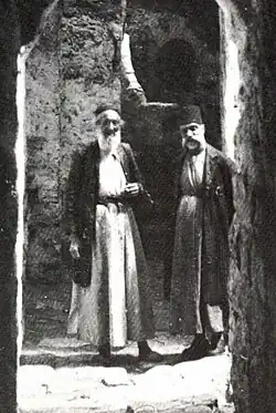 The Jewish community fluctuated between 8–10 families throughout the 16th century, and suffered from severe financial straits in the first half of the century.[92] In 1540, renowned kabbalist Malkiel Ashkenazi bought a courtyard from the small Karaite community, in which he established the Sephardic Abraham Avinu Synagogue.[93] In 1659, Abraham Pereyra of Amsterdam founded the Hesed Le'Abraham yeshiva in Hebron, which attracted many students.[94] In the early 18th century, the Jewish community suffered from heavy debts, almost quadrupling from 1717 to 1729,[95] and were "almost crushed" from the extortion practiced by the Turkish pashas. In 1773 or 1775, a substantial amount of money was extorted from the Jewish community after a false allegation that the son of a local sheikh was murdered and thrown into a cesspit. Emissaries from the community were frequently sent overseas to solicit funds.[96][97] During the Ottoman period, the dilapidated patriarchs' tombs were restored to a semblance of dignity.[98] Ali Bey, in Muslim disguise, was one of the few Westerners to gain access. In 1807 he reported that the sepulchres were covered with carpets of green silk embroidered in gold and those of the wives were covered in red silk.The sultans of Constantinople furnished these carpets, which were renewed from time to time. Ali Bey counted nine, one over the other, on the sepulchre of Abraham.[99] Hebron also became known for its glass production, based on Bedouin trade networks that brought up minerals from the Dead Sea. The industry is mentioned in travel literature in 19th century written by Western travelers to Palestine. Ulrich Jasper Seetzen noted during his travels in Palestine in 1808–09 that 150 persons were employed in the glass industry in Hebron,[100] based on 26 kilns.[101] In 1833, a report on the town in the weekly paper of the London-based Religious Tract Society wrote that Hebron had numerous well-provisioned shops and produced glass lamps which were exported to Egypt.[102] Early 19th-century travelers also noted Hebron's flourishing agriculture. It was a major exporter of dibse, grape sugar,[103] from the famous Dabookeh grapestock characteristic of Hebron.[104]