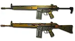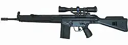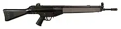 The Heckler & Koch G3 (German: Gewehr 3) is a select-fire battle rifle chambered in 7.62×51mm NATO developed in the 1950s by the German firearms manufacturer Heckler & Koch, in collaboration with the Spanish state-owned firearms manufacturer CETME.[2] The G3 was the service rifle of the German Bundeswehr until it was replaced by the Heckler & Koch G36 in the 1990s, and was adopted into service with numerous other countries.
