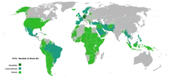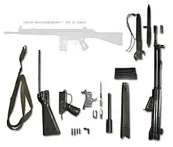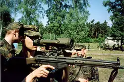 Initial production G3 rifles differed substantially from more recent models; early rifles featured closed-type mechanical flip-up sights (with two apertures), a lightweight folding bipod, a stamped sheet steel handguard, a wooden buttstock (in fixed stock models) or a telescopic metal stock.[8] Before delivery to the Bundeswehr, each G3 went through functional checks, zeroing the sight line (Anschießen) and a shooting test at the factory. In the process, five shots were fired at a target at 100 metres (109 yd) with particularly accurate sighting-in ammunition. The 5-shot group could not exceed 120 mm (4.7 in) (1.2 mil/4.13 MOA) diameter. The weapon was modernized during its service life (among other minor modifications it received new sights, a different flash suppressor, and a synthetic handguard and shoulder stock), resulting in the most recent production models, the G3A3 (with a fixed polymer stock) and the G3A4 (telescoping metal stock). The rifle proved successful in the export market, being adopted by the armed forces of over 40 countries.[8] Of that figure, 18 countries undertook domestic production of the G3 under license.[10] Known manufacturers of the weapon included France (MAS), Greece (Hellenic Defence Systems), Iran (Defense Industries Organization), Luxembourg (Luxemburg Defense Technologie), Mexico, Myanmar, Norway (Kongsberg Våpenfabrikk), Pakistan (Pakistan Ordnance Factories), Portugal (FBP), Saudi Arabia (Military Industries Corporation (Saudi Arabia)), Sweden (Husqvarna Vapenfabrik AB and FFV Carl-Gustaf in Eskilstuna), Thailand, Turkey (MKEK) and the United Kingdom (Royal Ordnance).[8]