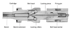 The bolt features an anti-bounce mechanism that prevents the bolt from bouncing off the barrel's breech surface. The "bolt head locking lever" is a spring-loaded claw mounted on the bolt carrier that grabs the bolt head as the bolt carrier group goes into battery. The lever essentially ratchets into place with friction, providing enough resistance to being re-opened that the bolt carrier does not rebound. The spring-powered claw extractor is also contained inside the bolt while the lever ejector is located inside the trigger housing (actuated by the recoiling bolt).[8]