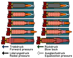 Based on the geometric relationship arising from the angles of the roller contact surfaces of the locking piece and the barrel extension recesses, the recoil of the bolt head is delayed by a ratio of 4:1 for the 7.62×51mm NATO chambering. Thus during the same period of time, the bolt head carrier moves 4 times faster than the bolt head. This ratio is continued until the locking rollers have been withdrawn from the barrel extension recesses.
