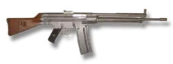 The origin of the G3 can be traced back to the final years of World War II when Mauser engineers at the Light Weapon Development Group (Abteilung 37) at Oberndorf am Neckar designed the Maschinenkarabiner Gerät 06 (MKb Gerät 06, "machine carbine device 06") prototype assault rifle chambered for the intermediate 7.92×33mm Kurz cartridge, first with the Gerät 06 model using a roller-locked short recoil mechanism originally adapted from the MG 42 machine gun but with a fixed barrel and conventional gas-actuated piston rod.[4] With careful attention to the mechanical ratios, the gas system could be omitted.[5] The resultant weapon, Gerät 06H (the "H" suffix is an abbreviation for halbverriegelt - "half-locked") is known today as StG 45(M) (Sturmgewehr 45(M), assault rifle 45). However, there is no evidence that the term was ever officially used in the German Reich.[6] The weapon was not produced in significant numbers and the war ended before the first production rifles were completed.[7]