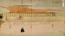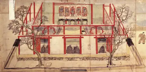 The largest building of the Dairi was the Throne Hall (紫宸殿, Shishinden), a building reserved for official functions. It was a rectangular hall measuring approximately 30 m (98 ft) east to west and 25 m (82 ft) north to south.[42] Along with its accompanying rectangular courtyard, the Shishinden was situated along the median north-south axis of the Dairi, facing the Shōmeimon gate. A tachibana orange tree and a cherry tree stood symmetrically on both sides of the front staircase of the building.[46] The courtyard was flanked on both sides by smaller halls connected to the Shishinden, creating the same configuration of buildings (influenced by Chinese examples) that was found in the aristocratic shinden-style villas of the period.[41][47][45]