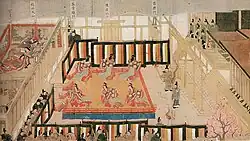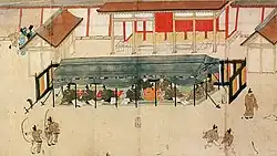 The Shishinden was used for official functions and ceremonies that were not held at the Daigokuden of the Chōdō-in complex. It took over much of the intended use of the larger and more formal building from an early date, as the daily business of government ceased to be conducted in the presence of the emperor in the Daigokuden already at the beginning of the ninth century.[35] Connected to this diminishing reliance on the official government procedures described in the ritsuryō code was the establishment of a personal secretariat to the emperor, the Chamberlain's Office (蔵人所, Kurōdodokoro). This office, which increasingly took over the role of coordinating the work of government organs, was set up in the Kyōshōden (校書殿), the hall to the south-west of the Shishinden.[48]