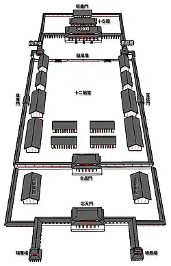 The Chōdō-in was a rectangular walled enclosure situated directly to the north of the Suzakumon gate in the centre of the southern wall of the Greater Palace.[32] It was based on Chinese models and followed Chinese architectural styles. Archaeological evidence from earlier capital palaces shows a generally stable design from the 7th century onwards. It was also called the Court of the Eight Ministries (八省院, Hasshō-in) as the corresponding compounds of the earlier Naniwa-kyō and Nagaoka-kyō palaces, which had eight halls in the central courtyard; however, as the Heian Palace compound had 12 halls, the traditional name was somewhat misleading, and the more accurate Court of the Twelve Halls (十二堂院, Jūnidō-in) was also used.[33]