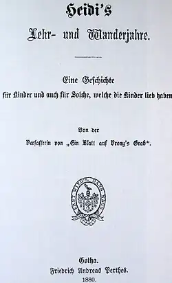 - ^ Spyri, Johanna (1880). Heidi's Lehr- und Wanderjahre: eine Geschichte für Kinder und auch für Solche, welche die Kinder lieb haben (Erstausg ed.). Gotha: F.A. Perthes.