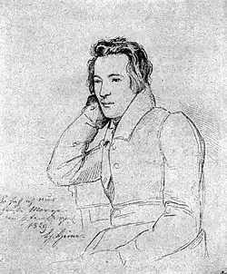 Another friend was the satirist Karl Immermann, who had praised Heine's first verse collection, Gedichte, when it appeared in December 1821.[46] During his time in Berlin, Heine also joined the Verein für Kultur und Wissenschaft der Juden, a society which attempted to achieve a balance between the Jewish faith and modernity. Since Heine was not very religious in outlook, he soon lost interest, but he also began to investigate Jewish history. He was particularly drawn to the Spanish Jews of the Middle Ages. In 1824, Heine began a historical novel, Der Rabbi von Bacherach, which he never finished.[47][48]