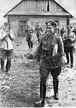 During the invasion, the German military mistreated and killed prisoners of war, ignoring both the Geneva Convention and their own army regulations.[36] Guderian's corps withdrew before the SS began its ethnic cleansing campaign. He learned of murder operations and of Jews being forced into Nazi ghettos from his son, Heinz Günther Guderian, who had witnessed some of them. There is no record of him having made any protest.[37]
