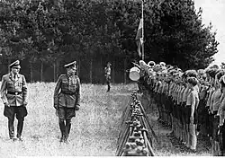 In 1927, Guderian was promoted to major and in October he was posted to the transport section of the Truppenamt, a clandestine form of the army's General Staff, which had been forbidden by the Treaty of Versailles.[11] By the autumn of 1928, he was a leading speaker on tanks; however, he did not set foot in one until the summer of 1929, when he briefly drove a Swedish Stridsvagn m/21-29.[11] In October, 1928 he was transferred to the Motor Transport Instruction Staff to teach.[7] In 1931, he was promoted to lieutenant-colonel and became chief of staff to the Inspectorate of Motorized Troops under Oswald Lutz.[7] This placed Guderian at the center of Germany's development of mobile warfare and armored forces.[7]