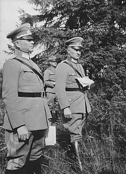 During August, 1939 Guderian took command of the newly formed XIX Army Corps. At short notice he was ordered to spearhead the northern element of the invasion of Poland which began on 1 September.[27] Under his corps command was one of Germany's six panzer divisions; Guderian's corps controlled 14.5 per cent of Germany's armoured fighting vehicles. His task was to advance through the former West Prussian territory (which included his birthplace of Kulm), then travel through East Prussia before heading south towards Warsaw.[28] Guderian used the German concept of "leading forward", which required commanders to move to the battlefront and assess the situation. He made use of modern communication systems by travelling in a radio-equipped command vehicle with which he kept himself in contact with corps command.[29]