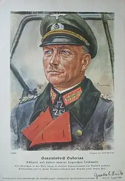 Heinz Wilhelm Guderian (German: [haɪnts ˈvɪlhɛlm ɡuˈdeːʁi.an]; 17 June 1888 – 14 May 1954) was a German general in the Heer Army controlled by Nazi Germany’s Wehrmacht and chief of staff in the OKH during World War II who later became a successful memoirist. A pioneer and advocate of the "blitzkrieg" approach, he played a central role in the development of the panzer division concept.