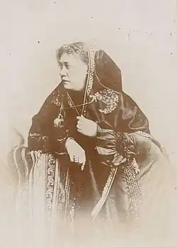 Blavatsky's family was aristocratic.[9] Her mother was Helena Andreyevna Hahn von Rottenstern (Russian: Елена Андреевна Ган, 1814–1842; née Fadeyeva), a self-educated 17-year-old daughter of Princess Yelena Pavlovna Dolgorukaya, who was a similarly self-educated aristocrat.[10] Blavatsky's father was Pyotr Alexeyevich Hahn von Rottenstern (Russian: Пётр Алексеевич Ган, 1798–1873), a descendant of the German Hahn aristocratic family, served as a captain in the Russian Royal Horse Artillery, later attaining the rank of colonel.[11] Pyotr had not been present at his daughter's birth, having been in Poland fighting to suppress the November Uprising against Russian rule, and first saw her when she was six months old.[12] As well as her Russian and German ancestry, Blavatsky could also claim French heritage, for a great-great grandfather had been a French Huguenot nobleman who had fled to Russia to escape persecution, there serving in the court of Catherine the Great.[13]