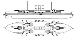 Tirpitz's hesitation at increasing the armament of the new ships was lost when it became known in early 1907 that the United States Navy was building battleships with 30.5 cm guns. In March 1907, Tirpitz ordered the Construction Department to prepare a design with 30.5 cm guns and 320 mm (13 in) thick belt armor.[4] Some dispute remained over the arrangement of the main battery. The two Minas Geraes-class battleships being built for Brazil mounted the same number of guns, but in a more efficient arrangement. Superfiring turret pairs were placed on either end of the ship, with two wing turrets amidships. Tirpitz favored adopting this arrangement for the Helgoland class, but the Construction Department felt two superfiring turrets could be easily disabled by a single hit. As a result, the hexagonal arrangement of the preceding Nassaus was retained.[5]