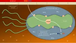 In addition to using chemotaxis to avoid areas of high acidity (low pH), H. pylori also produces large amounts of urease, an enzyme which breaks down the urea present in the stomach to produce ammonia and bicarbonate, which are released into the bacterial cytosol and the surrounding environment, creating a neutral area.[94] The decreased acidity (higher pH) changes the mucus layer from a gel-like state to a more viscous state that makes it easier for the flagella to move the bacteria through the mucosa and attach to the gastric epithelial cells.[94] Helicobacter pylori is one of the few known types of bacteria that has a urea cycle which is uniquely configured in the bacterium.[95] 10% of the cell is of nitrogen, a balance that needs to be maintained. Any excess is stored in urea excreted in the urea cycle.[95]
