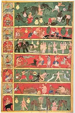 The idea of retribution for evil thoughts and evil deeds features almost universally in human cultural history. Accordingly, justice may be carried out post-mortem, wherby positing a place of punishment in the afterlife.[8] As early as 1500 BCE, the Egyptians asserted that the dead will be judged and, if found guilty, punished and tortured for their crimes.[8][9] One of the oldest detailed descriptions of hell, however, are probably found in the Kathāvatthu, one of the earliest Buddhist writings written around 250—100 BCE.[10] It argues that hell is a state as the result of a bad action,[11] connecting hell to the concept of the retribution for bad actions and compensation for good actions.[12] Such concept of hell did not require the existence of a God and does not depend on deities.
