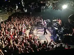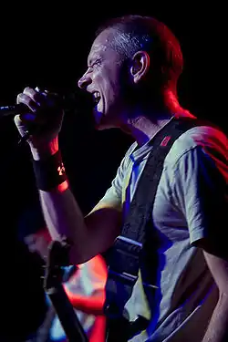 The New York Times called Helmet "a band that made important connections between indie-rock and metal."[53] Helmet have been cited as an influence by a number of key nu metal and industrial metal bands, including Limp Bizkit, Papa Roach, and Fear Factory.[57][58][59] Musician Mike Patton has also cited Helmet as having a significant influence on his solo career; with original drummer John Stanier and Patton having played together in Tomahawk. Helmet is considered a major influence on nu-metal,[60][61] with the band's use of drop tuning influencing many in the genre. Hamilton, displeased with this connection, said in 2011 "it's frustrating that people write [us] off because we're affiliated with or credited with or discredited with creating nu-metal and rap metal or whatever the fuck it is, which we sound nothing like."[62] Despite this, Hamilton would later collaborate with nu metal bands Linkin Park and P.O.D.[63][64]