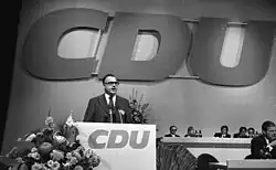 In January 1955, Kohl ran for a seat on the board of the Rhineland-Palatinate CDU, losing just narrowly to the state's Minister of Family Affairs, Franz-Josef Wuermeling.[18] Kohl was still able to take up a seat on the board, being sent there by his local party branch as a delegate.[20] During his early years in the party, Kohl aimed to open it towards the young generation, turning away from a close relationship with the churches.[21]