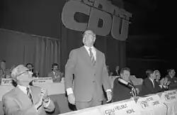 Kohl moved up into the federal board (Vorstand) of the CDU in 1964.[31] Two years later, shortly before his election as chairman of the party in Rhineland-Palatinate, he failed at an attempt to be voted into the executive committee (Präsidium) of the party.[32] After the CDU lost its involvement in the federal government for the first time since the end of World War II in the 1969 election, Kohl was elected into the committee.[33] While former chancellor Kurt Georg Kiesinger remained chairman of the CDU until 1971, it was now parliamentary chairman Rainer Barzel who led the opposition against the newly formed social-liberal coalition of Willy Brandt.[34]