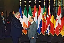On 22 September 1984, Kohl met French president François Mitterrand at Verdun, where the Battle of Verdun between France and Germany had taken place during World War I. Together, they commemorated the deaths of both World Wars. The photograph, which depicted their minutes-long handshake became an important symbol of French-German reconciliation. Kohl and Mitterrand developed a close political relationship, forming an important motor for European integration.[54] Together they laid the foundations for European projects, like Eurocorps and Arte. In 1985, alongside European leaders from 16 other countries, they founded Eureka: a research and development network of national funding ministries and agencies (distinct from the European Union) that fund and support collaborative international projects. This French-German cooperation also was vital for important European projects, like the Treaty of Maastricht and the Euro.[55]