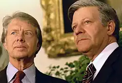 Schmidt became Chancellor of West Germany on 16 May 1974, after Brandt's resignation in the wake of an espionage scandal. The worldwide economic recession was the main problem his administration faced, and Schmidt took a tough and disciplined line, in reduction of public spending.[23] Schmidt was also active in improving relations with France. Together with the French President Valéry Giscard d'Estaing, he was one of the fathers of the world economic summits, the first of which assembled in 1975.[24] In 1975, he was a signatory of the Helsinki Accords to create the Conference for Security and Co-operation in Europe, the precursor of today's OSCE.[25] In 1978, he helped set up the European Monetary System (EMS).