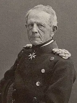 Helmuth Karl Bernhard Graf von Moltke (German: [ˈhɛlmuːt fɔn ˈmɔltkə]; 26 October 1800 – 24 April 1891) was a Prussian field marshal.[1] The chief of staff of the Prussian Army for thirty years, he is regarded as the creator of a new, more modern method of directing armies in the field and one of the finest military minds of his generation. He commanded troops in Europe and the Middle East, in the Second Schleswig War, Austro-Prussian War, and Franco-Prussian War. He is described as embodying "Prussian military organization and tactical genius".[2] He was fascinated with railways and pioneered their military use.[3][4] He is often referred to as Moltke the Elder to distinguish him from his nephew Helmuth von Moltke the Younger (Helmuth Johann Ludwig von Moltke), who commanded the German army at the outbreak of the First World War. He is notably the earliest-born human whose recorded voice is preserved, being born in the last year of the 18th century (1800). He made four recordings; two that were recorded in October 1889 are preserved to this day.