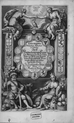 In the first half of the 17th century, no single allegory was identified as Helvetia. Rather, several allegories represented both virtues and vices of the confederacy. On the title page of his 1642 Topographia, Matthäus Merian depicted two allegorical figures seated below the title panel: one is the figure of an armed Eidgenosse, representing Swiss military prowess and sovereignty, the other is a female Abundantia allegory crowned with a city's ramparts.[2]