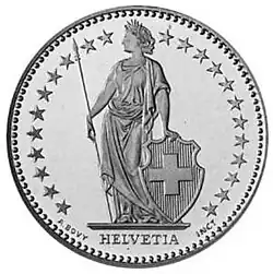 Standing Helvetia on obverse of a Swiss 2-franc coin