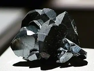 Hematite occurs naturally in black to steel or silver-gray, brown to reddish-brown, or red colors. It is mined as an important ore mineral of iron. It is electrically conductive.[7] Hematite varieties include kidney ore, martite (pseudomorphs after magnetite), iron rose and specularite (specular hematite). While these forms vary, they all have a rust-red streak. Hematite is not only harder than pure iron, but also much more brittle. The term kidney ore may be broadly used to describe botryoidal, mammillary, or reniform hematite.[8] Maghemite is a polymorph of hematite (γ-Fe
