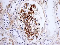 Immunostaining showing IgA in the glomerulus of a patient with Henoch–Schönlein nephritis