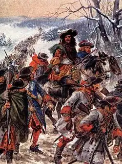 Turenne began the 1645 campaign with a successful forward movement,[23][2] but Mercy managed to deceive him into thinking the Bavarians were scattered and far away[24] and he was taken by surprise and defeated at Mergentheim.[25][2] While Turenne had quickly ordered his forces to unite one of his subordinates, general Rosen, was not informed on the situation, defied the order, leading to defeat while Turenne's main force was winning.[26] Turenne's army lost all of its artillery and baggage and five-sixths of its infantry.[27] Turenne retreated to Hesse, which caused its forces to join the French as well as a Swedish force and reinforcements under Condé, who took command once again.[28][8] The Swedes soon departed, but Enghien commanded still 17,000 men.[29] The French marched into Bavaria with facing little opposition until they caught up with Mercy's retreating army.[29] Mercy inflicted casualties on the French in an artillery duel and outmanoeuvred them in the march on Allerheim, buying time to fortify his position.[30] Turenne advised not to fight but this was rejected by Condé. Turenne's plan of attack was accepted by Condé.[31] The following battle was a French victory and Mercy was killed but the French had suffered heavily. Ill health forced Enghien to retire soon afterwards, leaving Turenne for the third time in command of the French army.[8] He was met by superior imperial forces and forced to retreat.[32][8] At Philippsburg, Turenne crossed the Rhine using a bridge made of boats.[33]