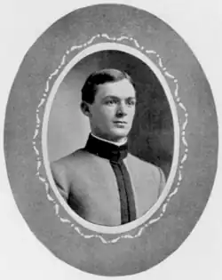Arnold entered the United States Military Academy at West Point as a "Juliette" (one month late), having just turned 17. His cadet career was spent as a "clean sleeve" (cadet private).[11] At the academy he helped found the "Black Hand", a group of cadet pranksters, and led it during his first class year. He played second-team running back for the varsity football team, was a shot putter on the track and field team, and excelled at polo. Arnold's academic standing varied between the middle and the lower end of his class, with his better scores in mathematics and science. He wanted assignment to the Cavalry but an inconsistent demerit record[12] and a cumulative general merit class standing of 66th out of 111 cadets resulted in his being commissioned on 24 June 1907, as a second lieutenant, Infantry.[13] He initially protested the assignment (there was no commissioning requirement for USMA graduates in 1907), but was persuaded to accept a commission in the 29th Infantry, at the time stationed in the Philippines.[14] Arnold arrived in Manila on 7 December 1907.[15]