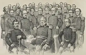 As the Civil War began, Halleck was nominally a Democrat and was sympathetic to the South, but he had a strong belief in the value of the Union.[3] His reputation as a military scholar and an urgent recommendation from Winfield Scott earned him the rank of major general in the regular army, effective August 19, 1861, making him the fourth most senior general, after Scott, George B. McClellan, and John C. Frémont.[7] He was assigned to command the Department of the Missouri, replacing Frémont in St. Louis on November 9, and his talent for administration quickly sorted out the chaos of fraud and disorder left by his predecessor.[3] He set to work on the "twin goals of expanding his command and making sure that no blame of any sort fell on him."[8]