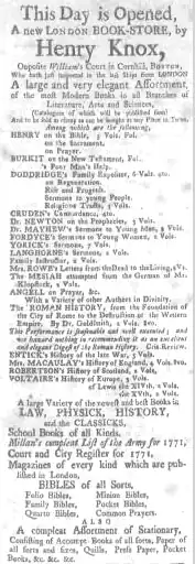 On March 5, 1770, Knox was a witness to the Boston Massacre. According to his affidavit, he attempted to defuse the situation, trying to convince the British soldiers to return to their quarters.[13] He also testified at the trials of the soldiers, in which all but two were acquitted.[14] In 1771 he opened his own bookshop, the London Book Store, in Boston "opposite William's Court in Cornhill."[15][16] The store was, in the words of a contemporary, a "great resort for the British officers and Tory ladies, who were the ton at that period."[17] Boasting an impressive selection of excellent English products and managed by a friendly proprietor, it quickly became a popular destination for the aristocrats of Boston. As a bookseller, Knox built strong business ties with British suppliers and developed relationships with his customers, but retained his childhood aspirations.[18] Largely self-educated, he stocked books on military science, and also questioned soldiers who frequented his shop in military matters. Knox initially enjoyed reasonable pecuniary success, but his profits slumped after the Boston Port Bill and subsequent citywide boycott of British goods.[19] In 1772 he cofounded the Boston Grenadier Corps as an offshoot of The Train, and served as its second in command. Shortly before his 23rd birthday Knox accidentally discharged a gun, shooting two fingers off his left hand. He managed to bind the wound up and reach a doctor, who sewed the wound up.[20]