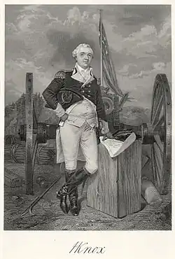 Knox was promoted to major general on March 22, 1782; he became the army's youngest major general.[69] He and Congressman Gouverneur Morris were assigned to negotiate prisoner exchanges with the British. These negotiations failed because the sides could not agree on processes and terms for matching various classes of captives.[70] He joined the main army at Newburgh, New York, and inspected the facilities at West Point, considered a crucial defensive position. After enumerating its defects and needs, Washington appointed him its commander in August 1782. The next month he was devastated by the death of his nine-month-old son, and fell into a depression.[71] He soldiered on, however, becoming involved in negotiations with the Confederation Congress and Secretary of War Benjamin Lincoln over the issue of pensions and overdue compensation for the military. Knox wrote a memorial, signed by a number of high-profile officers, suggesting that Congress pay all back pay immediately and offer a lump-sum pension rather than providing half-pay for life.[72] The unwillingness of Congress to deal with the issue prompted Knox to write a warning letter, in which he wrote "I consider the reputation of the American army as one of the most immaculate things on earth, and that we should even suffer wrongs and injuries to the utmost verge of toleration rather than sully it in the least degree. But there is a point beyond which there is no sufferance. I pray we will sincerely not pass it."[73] When rumors of mutiny in the higher rank circulated in March 1783, Washington held a meeting in which he made an impassioned plea for restraint. In the meeting, Knox introduced motions reaffirming the officers' attachment to Washington and Congress, helping to defuse the crisis.[74] Because of the unresolved issues, however, Knox and others became vigorous proponents of a stronger national government, something which leading political leaders (including Thomas Jefferson, John Hancock, and Samuel Adams) opposed at the time.[75]