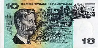 He was featured on the first (paper) Australian ten-dollar note issued in 1966 when decimal currency was first introduced into Australia. Lawson was pictured against scenes from the town of Gulgong in NSW.[34] This note was replaced by a polymer note in 1993; the polymer series had different people featured on the notes.