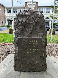 It was in Mrs Isabel Byers' home that Henry Lawson died, of a cerebral hemorrhage, in Abbotsford, Sydney in 1922. He was given a state funeral. His death registration on the NSW Births, Deaths & Marriages index[26] is ref. 10451/1922 and was recorded at the Petersham Registration District.[27] It shows his parents as Peter and Louisa. His funeral was attended by the Prime Minister Billy Hughes and the (later) Premier of New South Wales, Jack Lang (who was the husband of Lawson's sister-in-law Hilda Bredt), as well as thousands of citizens. He is interred at Waverley Cemetery[28] Lawson was the first person to be granted a New South Wales state funeral (traditionally reserved for Governors, Chief Justices, etc.) on the grounds of having been a 'distinguished citizen'.[23]