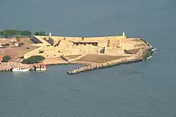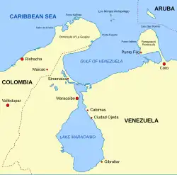 The loss of Oxford meant Morgan's flotilla was too small to attempt an attack on Cartagena. Instead he was persuaded by a French captain under his command to repeat the actions of the pirate François l'Olonnais two years previously: an attack on Maracaibo and Gibraltar, both on Lake Maracaibo in modern-day Venezuela.[51] The French captain knew the approaches to the lagoon, through a narrow and shallow channel. Since l'Olonnais and the French captain had visited Maracaibo, the Spanish had built the San Carlos de la Barra Fortress, 20 miles (32 km) outside the city, on the approach. Talty states that the fortress was placed in an excellent position to defend the town, but that the Spanish had undermanned it, leaving only nine men to load and fire the fortress's 11 guns.[52] Under covering cannon fire from the privateer's flagship, Lilly, Morgan and his men landed on the beach and stormed the fortification; they found it empty when they eventually breached its defences. A search soon found that the Spanish had left a slow-burning fuse leading to the fort's powder kegs as a trap for the buccaneers, which Morgan extinguished.[53] The fort's guns were spiked and then buried so they could not be used against the privateers when they returned from the rest of their mission.[54]